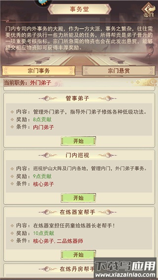 门派贡献主要通过事务堂执行任务获取,职务越高,单次任务所得贡献越多。此外,门派每百年会发布宗门悬赏,完成亦可获得贡献。