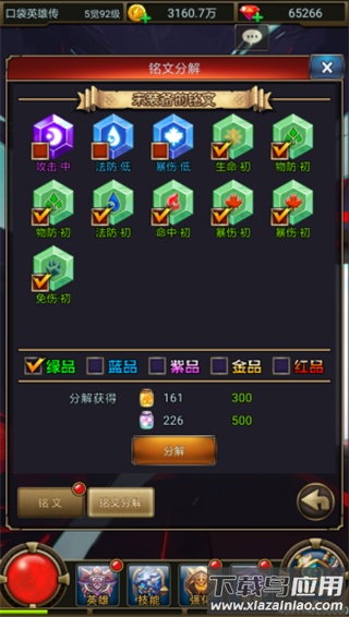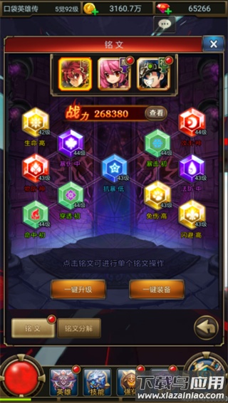 角色完成二次觉醒后,将开启死亡之塔与铭文系统;每位英雄可装备一套铭文,其品质由低到高分为绿色、蓝色、紫色、金色与红色,种类涵盖攻击、防御、生命等多种属性。