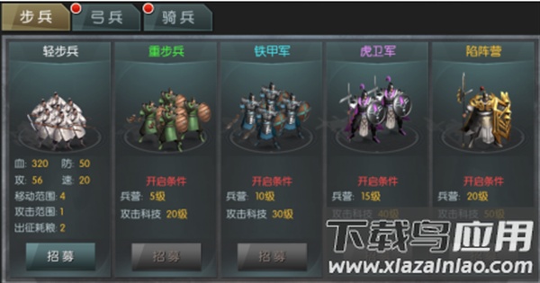 兵营是招募士兵的场所,兵营等级提升后,可招募的兵种类型也会增加;