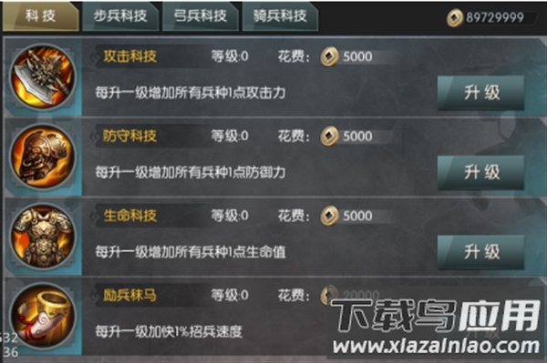在科技界面可以对兵种各项属性进行强化升级;