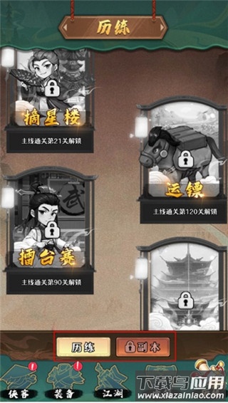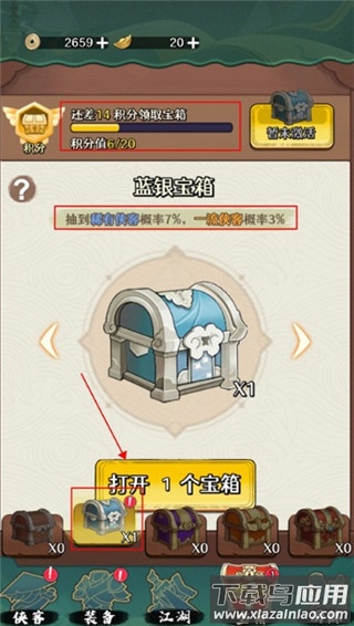 4、通过闯关与活动可获得宝箱,开启后有机会获得侠客,宝箱品质越高,开出高品质侠客的概率越大;
