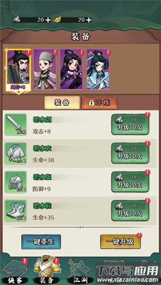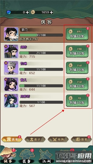 3、所有侠客均可升级,其等级与主角同步且无法超过主角,等级提升将直接增强战力;