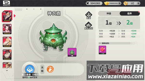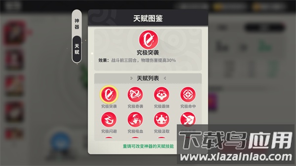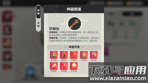 游戏内提供八种不同神器,每种神器均拥有独特效果,玩家可根据阵容需求选择搭配;神器自带天赋技能,可通过重铸操作改变其天赋技能。