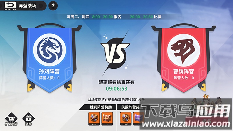 每周二、四的上午八点至晚上八点为报名时间,晚上八点至十一点为对战时段;报名结束后,玩家将被随机分配至“孙刘”或“曹魏”阵营; 玩家初始拥有150点活力值,每次对战无论胜负均消耗10点活力,失败则额外扣除10点,活力归零即被淘汰;比赛进行多轮匹配,直至一方阵营玩家全部淘汰或时间结束; 每次匹配胜利获得100积分,失败获得10积分;胜利方还将根据剩余血量百分比获得相应比例的积分加成;最终总积分更高的阵营取得胜利。