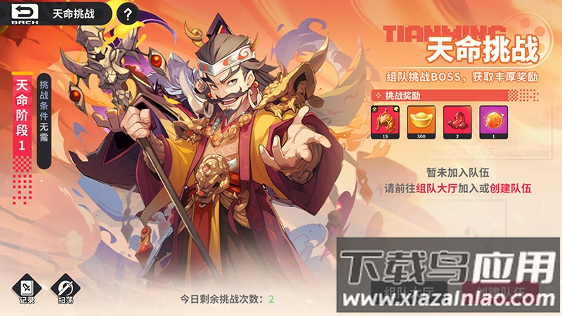 天命挑战调整为组队形式,每位玩家需上阵两名武将参与;单人也可挑战,但仅能上阵两名英雄,难度会大幅提升,因此建议邀请好友组队攻关; 挑战过程中,需选择奇书阶级以解锁下一阶级,阶级越高,所能获得的奖励越丰厚。