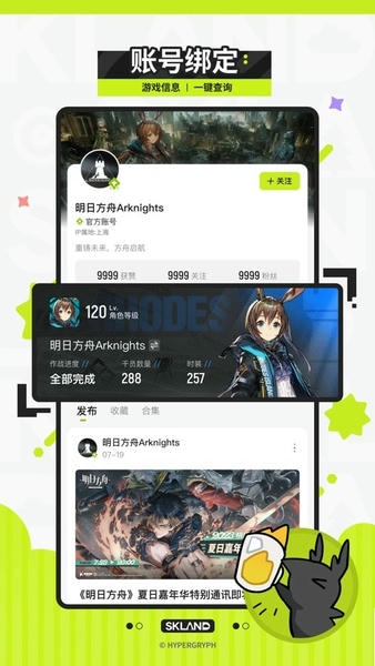 该社区汇集了丰富的游戏攻略、实用技巧与玩家心得;同时整合新闻和活动预告。用户能随时查询绑定账号内的角色详情、皮肤收藏及理智值等游戏数据,便于快速掌握个人进度。