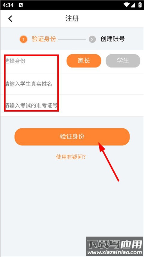 2、进入注册页面后,需选择身份(家长或学生),输入学生真实姓名与准考证号,点击验证身份以继续注册流程。