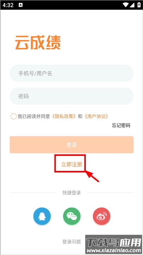 1、从本站下载应用,安装后打开进入登录界面,点击立即注册;也可选用QQ、微信或微博进行快捷登录。