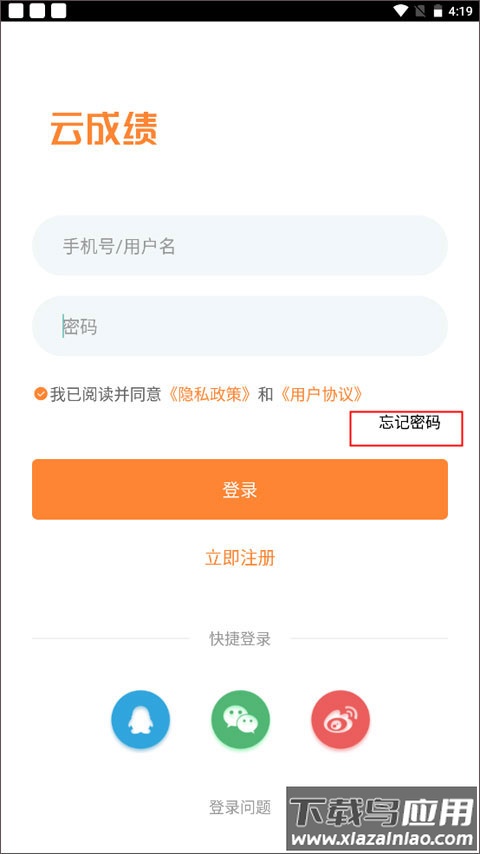 1、打开云成绩app登录页面,点击下方“找回密码”入口。