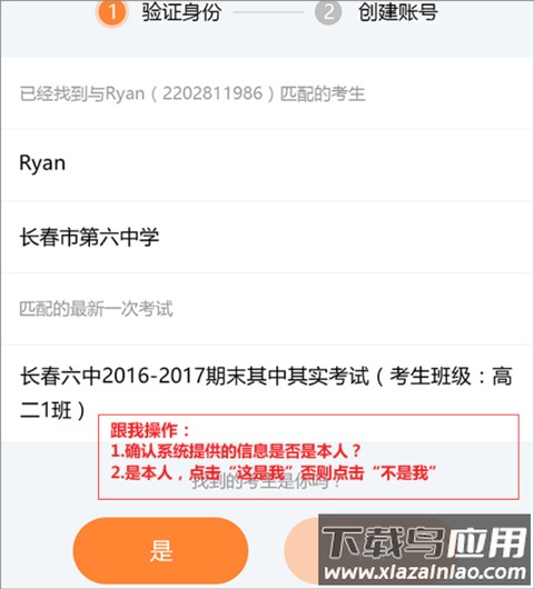 请确认页面显示的信息是否本人,若是则点击“是”;若非本人,请检查所填信息是否有误,或联系班主任核对考试使用的姓名与准考证号。
