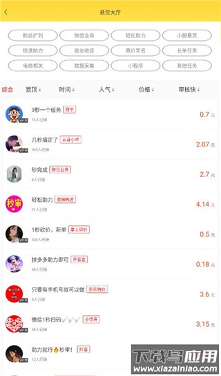 1、进入悬赏大厅,这里有丰富任务可供选择,包括微信相关、数据采集、实名认证、轻松助力及邀请好友等,均可赚取佣金;