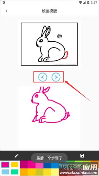 3、页面顶部画板显示绘画步骤教程,点击下方按钮可切换前后步骤,底部画板供用户跟随指导进行实际操作;