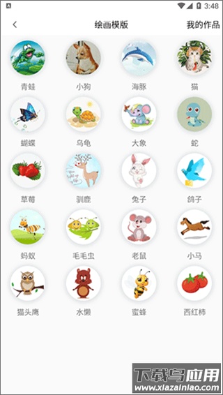 2、例如进入临摹功能,这里提供丰富的绘画模板,包括青蛙、小狗、海豚等形象,可任选其一进行练习;