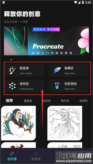 1、通过本站下载安装并打开软件,进入首页后可以看到创作馆板块,可选择配色库、临摹区、涂色区或色彩测试等功能;