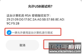 1、允许USB调试;通过USB数据线将Android设备连接至电脑,在设备弹出的授权窗口中允许USB调试(若非首次连接,此提示可能不显示)。