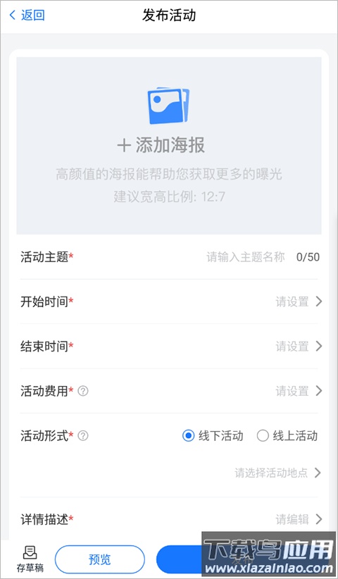 3. 完整填写活动内容、时间、费用等相关信息,最后点击发布即可完成。