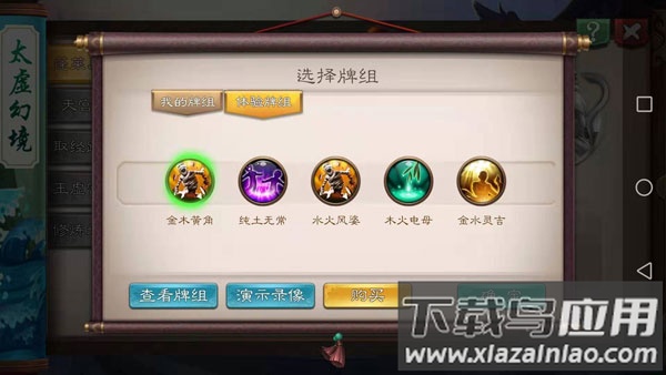 游戏设有太虚幻境、封神大阵、通天塔三大主要关卡。若玩家遇到困难,可在牌组界面中查看系统提供的对战录像作为参考。
