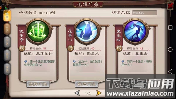 对战双方均拥有门派,不同门派会提供不同的初始生命值与技能。进入战斗界面后,首先应观察对手门派,结合经验推测其卡组构成,并据此调整换牌策略,因此熟悉各门派特点对取胜至关重要。