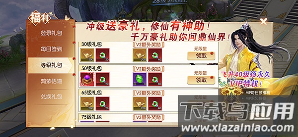 每日礼包中的道具性价比很高,尤其值得关注的是鸿蒙仙药·神(24小时双倍经验丹)和鸿蒙仙药·仙(30分钟三倍经验丹);其他道具如元宝等,也对后续坐骑、宠物及战力榜有积极作用,建议每日购买。