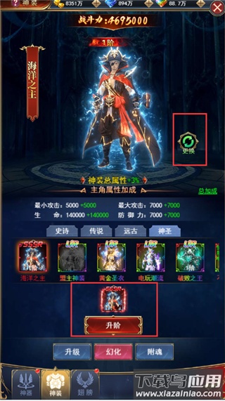 神圣品质的时装尤为突出,不仅能提供更高的属性加成,其外观设计也更为独特,流光特效的表现也更加华美炫目。点击“更换”即可应用已激活的幻化时装。若拥有多件相同时装,还可对其进行“升阶”,从而提升该时装的属性与战力。