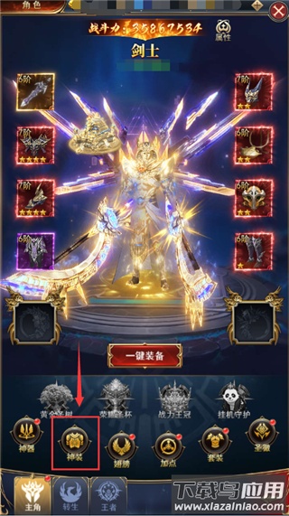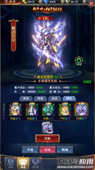 你可以在角色界面点击“神装”进入相关页面。神装界面主要包含升级、幻化、附魂三种功能玩法。其中“幻化”板块收录了各类时装造型,并按品质进行区分,从低到高依次为史诗、传说、远古、神圣。
