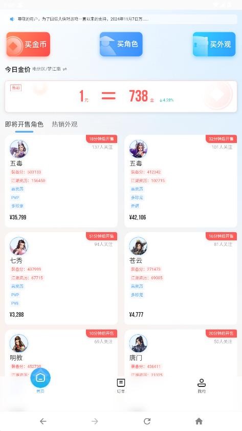 万宝楼交易平台是西山居为剑网三玩家打造的官方交易应用,现已推出手机版本。玩家能够通过手机便捷地完成金币、游戏角色以及各类外观道具的购买与出售,让游戏资产交易随时随地进行。