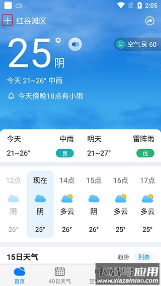 1、打开准时天气应用,点击界面左上角的加号图标,进入城市管理页面。