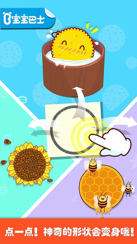 圆形、半圆和椭圆形能变出许多可爱的小精灵;害羞的饼干、顽皮的刺猬、香甜的西瓜,小朋友快看看你画出了什么;会唱歌的花洒、变魔术的火龙果、还有勤劳的小蜜蜂,点击屏幕就能邀请这些小动物一起玩耍。