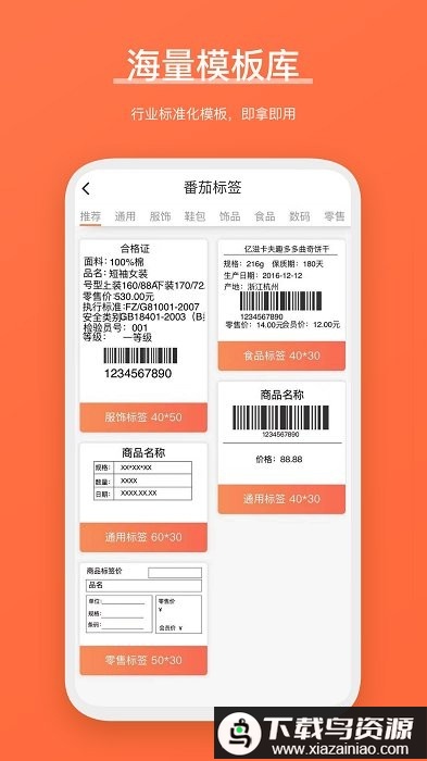丰富的模版库:拥有丰富的标签模版库,涵盖鞋包、服饰、食品、珠宝、数码等常见领域,即拿即用;支持在标准模版上插入任何形式的图标等。