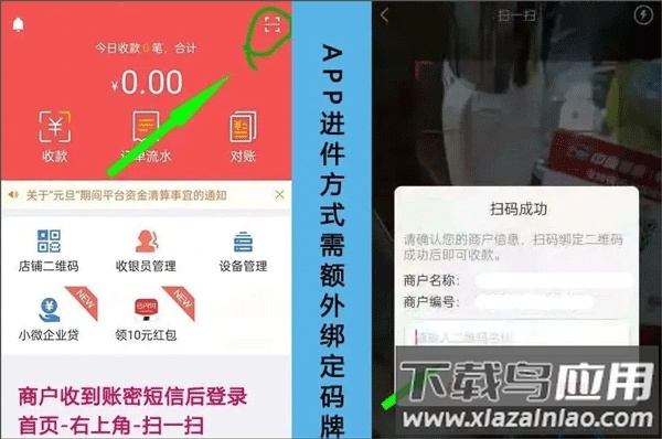 1、商户登录应用后,点击首页右上角扫一扫图标,扫描二维码牌并输入商户名称即可完成绑定;