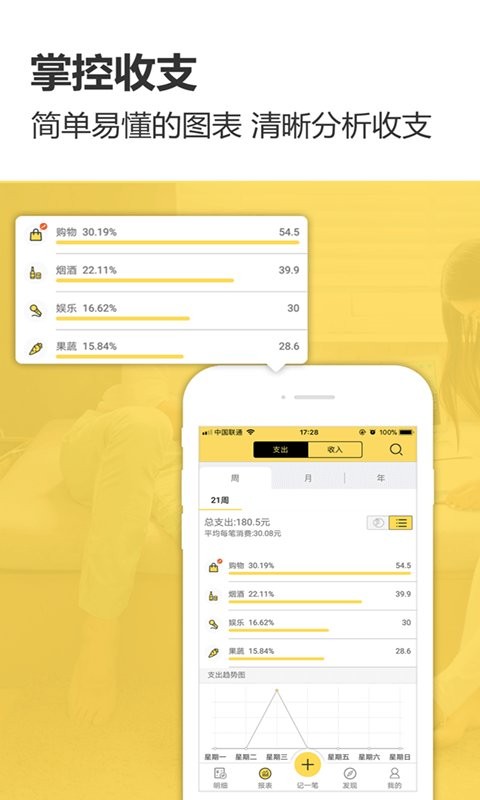 3. 专业图表:通过折线与饼状图,清晰呈现每周、每月的收支结构。