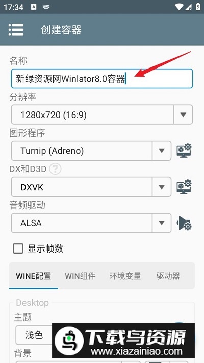 3、进入创建页面后,可自定义容器名称、屏幕分辨率、图形程序、DX与D3D选项以及音频驱动等参数;完成设置后点击右下角对钩,系统将提示容器正在生成。