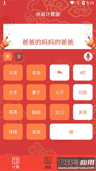 打开应用后无需注册登录,直接输入亲属关系即可开始计算,例如输入“爸爸的妈妈的爸爸”。