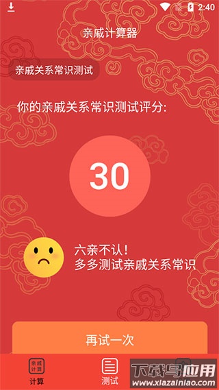完成共10道题的测试后,系统会给出趣味评价,让你在挑战中巩固亲属称谓知识。