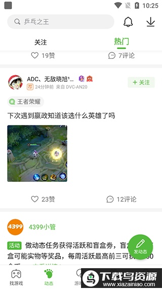 3、返回主界面,点击动态板块,可以浏览其他玩家分享的游戏动态与心得;