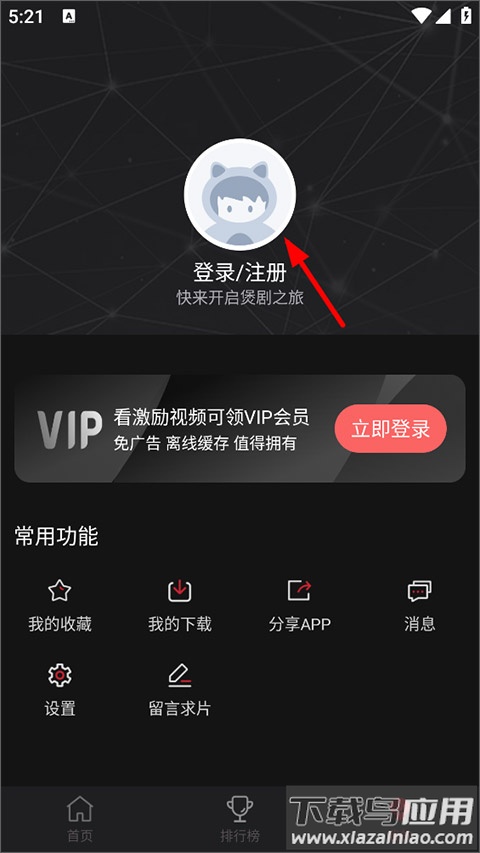 2、在“我的”页面,点击用户头像完成注册或登录;
