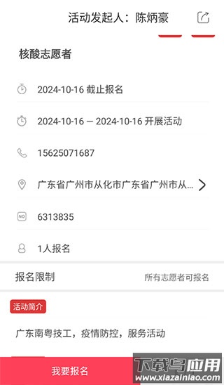 5、点击进入活动详情页,可查看报名截止时间、地点、联系方式、已报名人数及活动介绍,点击我要报名即可申请参与。