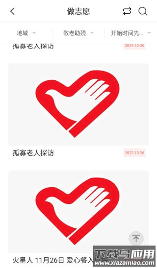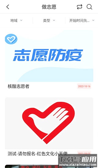 4、例如选择做志愿功能,可根据活动区域、类型及开始时间等条件筛选查看各类志愿活动。