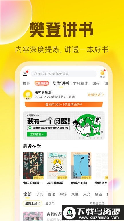 樊登本人每周讲解一本好书,用通俗易懂的方式提炼书中要义,为工作、生活与学习带来切实的启发与帮助。