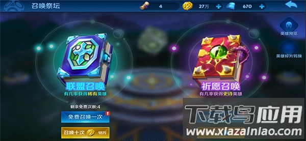4、联盟召唤每日有5次免费机会,祈愿召唤每24小时可免费进行一次。各类活动中也会赠送召唤券,可用于祈愿召唤。玩家还可提前预览召唤池中包含的英雄;