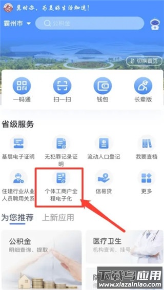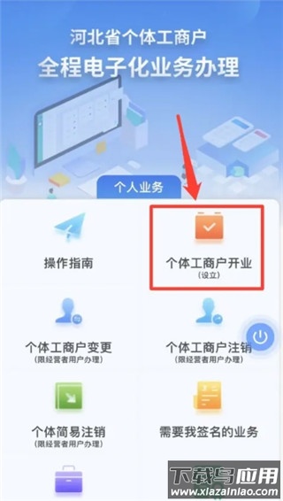 第一步:启动app后,在主页找到并点击“个体工商户全程电子化”选项;