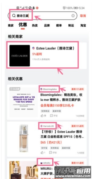 1、若用户想购买特定商品但不确定哪些网站有优惠,可直接在应用内搜索关键词,例如输入“雅诗兰黛”;