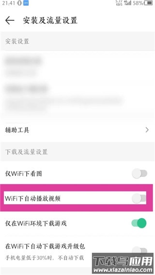 找到“WiFi下自动播放视频”这一项,点击旁边的滑块即可关闭自动播放功能。