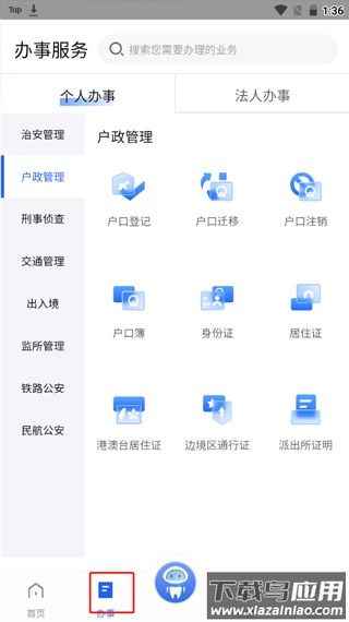 2、点击办事栏目,其中提供了治安管理、户政业务、刑事侦查、交通管理、出入境服务、监所管理、铁路公安及民航公安等各类办事入口;