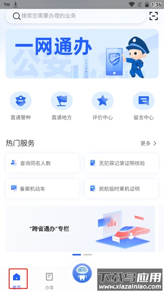 1、启动从本站下载的应用程序,进入主界面,可看到查询同名人数、机动车备案、无犯罪记录证明核验、民航临时乘机证明等常用功能;