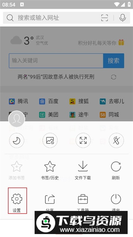 2.在浏览器主界面,点击底部菜单栏,进入设置选项。