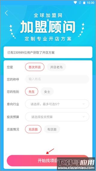 2、根据提示填写开店意向以及个人基本信息,完成信息录入后点击“开始找项目”。