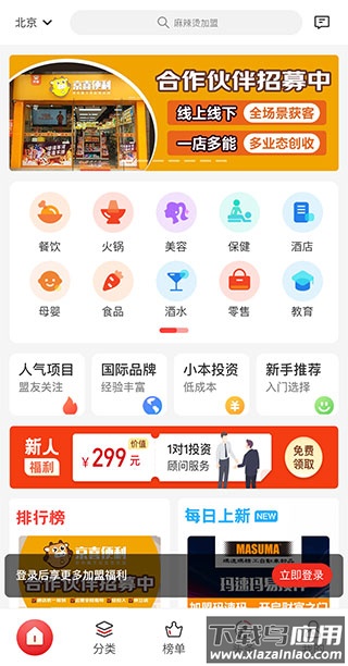 1、打开软件进入【首页】,可以看到常见的创业投资分类,例如餐饮、火锅、美容、保健等板块。