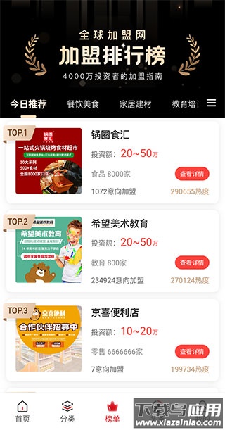 3、在【榜单】页面中,提供了各个分类下的加盟项目排名,如今日推荐、餐饮美食、家居建材等排行榜单。