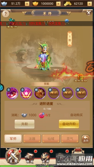 通过军师进阶、法器强化、仙域探索与灵气灌注等操作获得提升